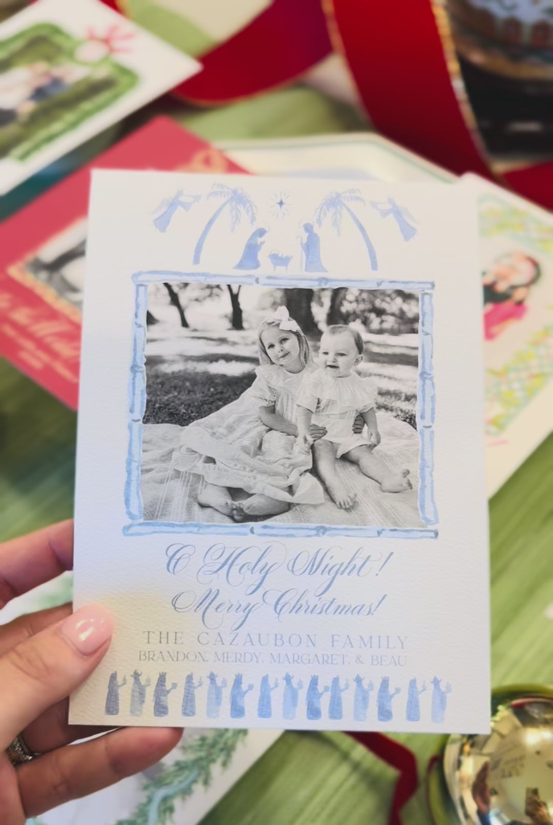 Celebrate the season with reverence and beauty. This design features a hand-painted nativity scene in soft blue silhouettes, framed with a delicate bamboo border, and topped with palm trees under the guiding star. Along the bottom, a pattern of the three wise men completes the artwork — a timeless nod to the story of Christmas.