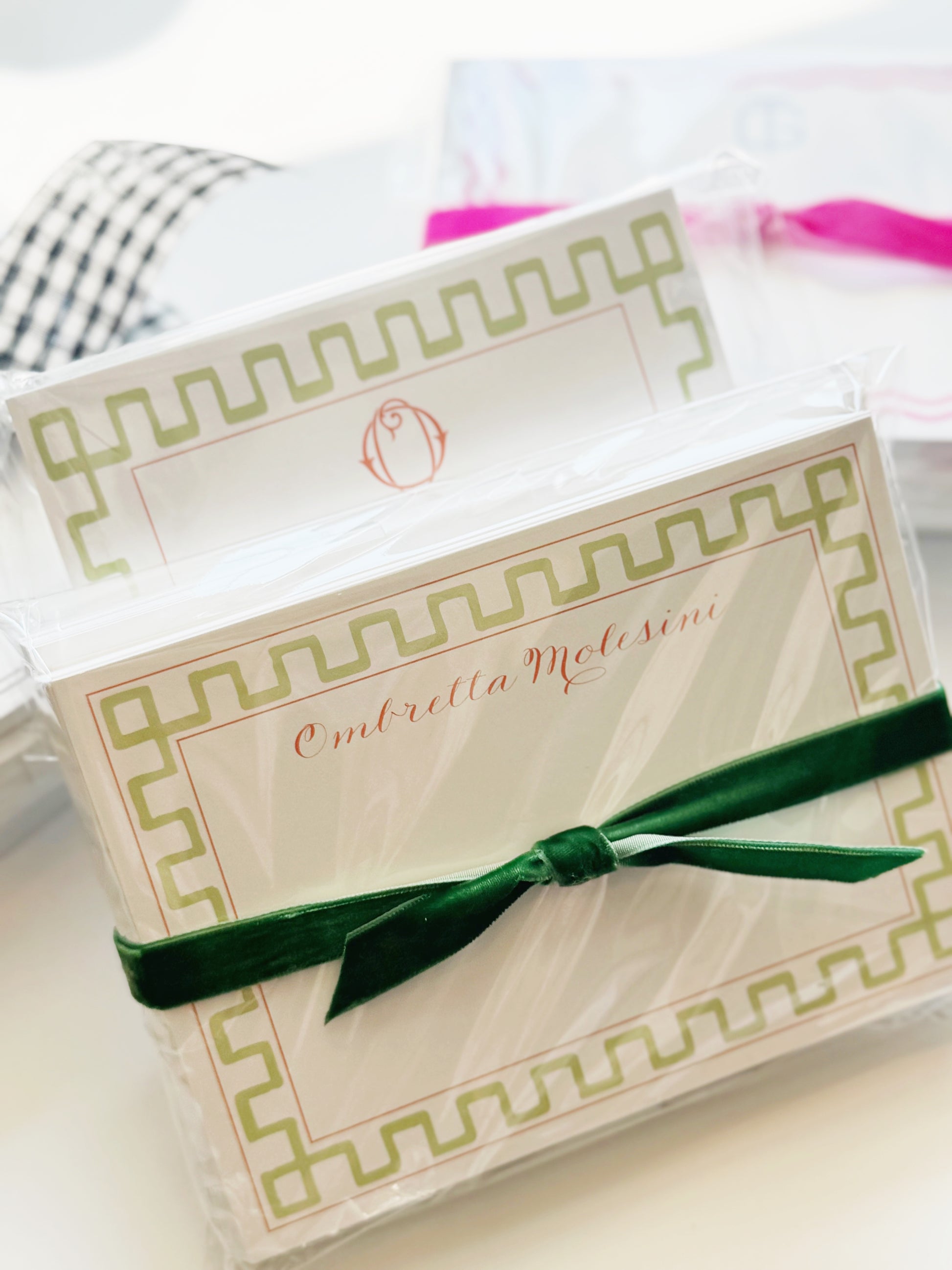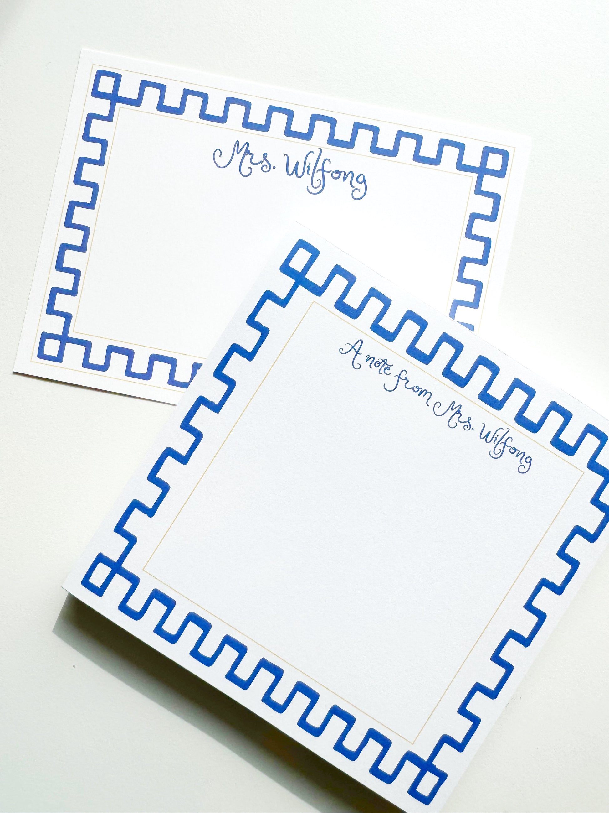 Make your messages pop with this charming Greek key design stationery — available as either a set of A2 note cards or a matching notepad! Customize wording and colors to create the perfect gift or personal treat.