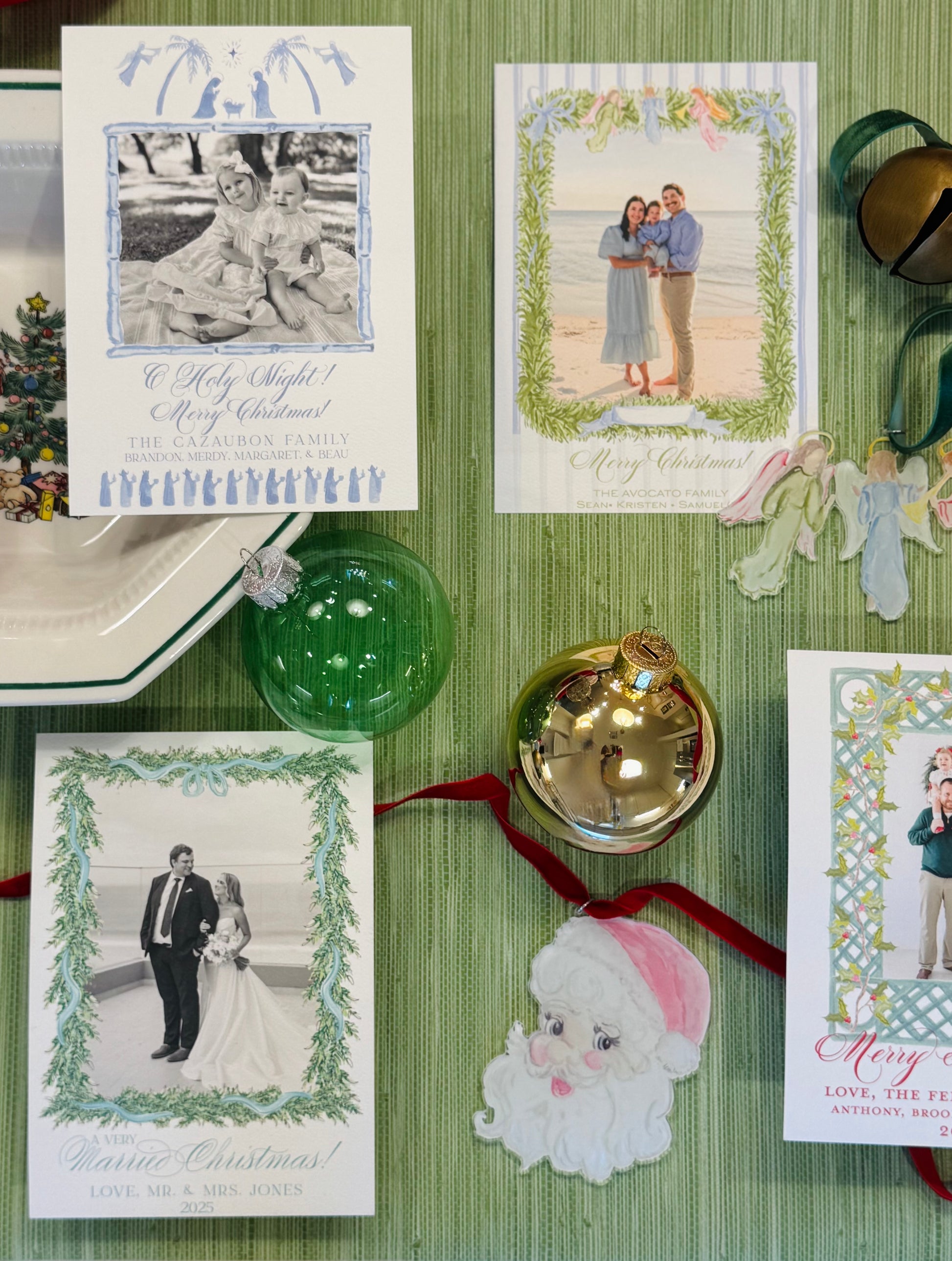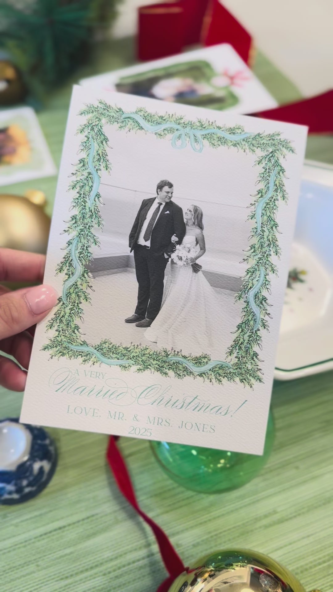 Elegant with a touch of blue — this design features a hand-painted green garland wrapped around the card, delicately interwoven with a soft blue bow. A timeless style with just the right amount of color to feel fresh and festive.