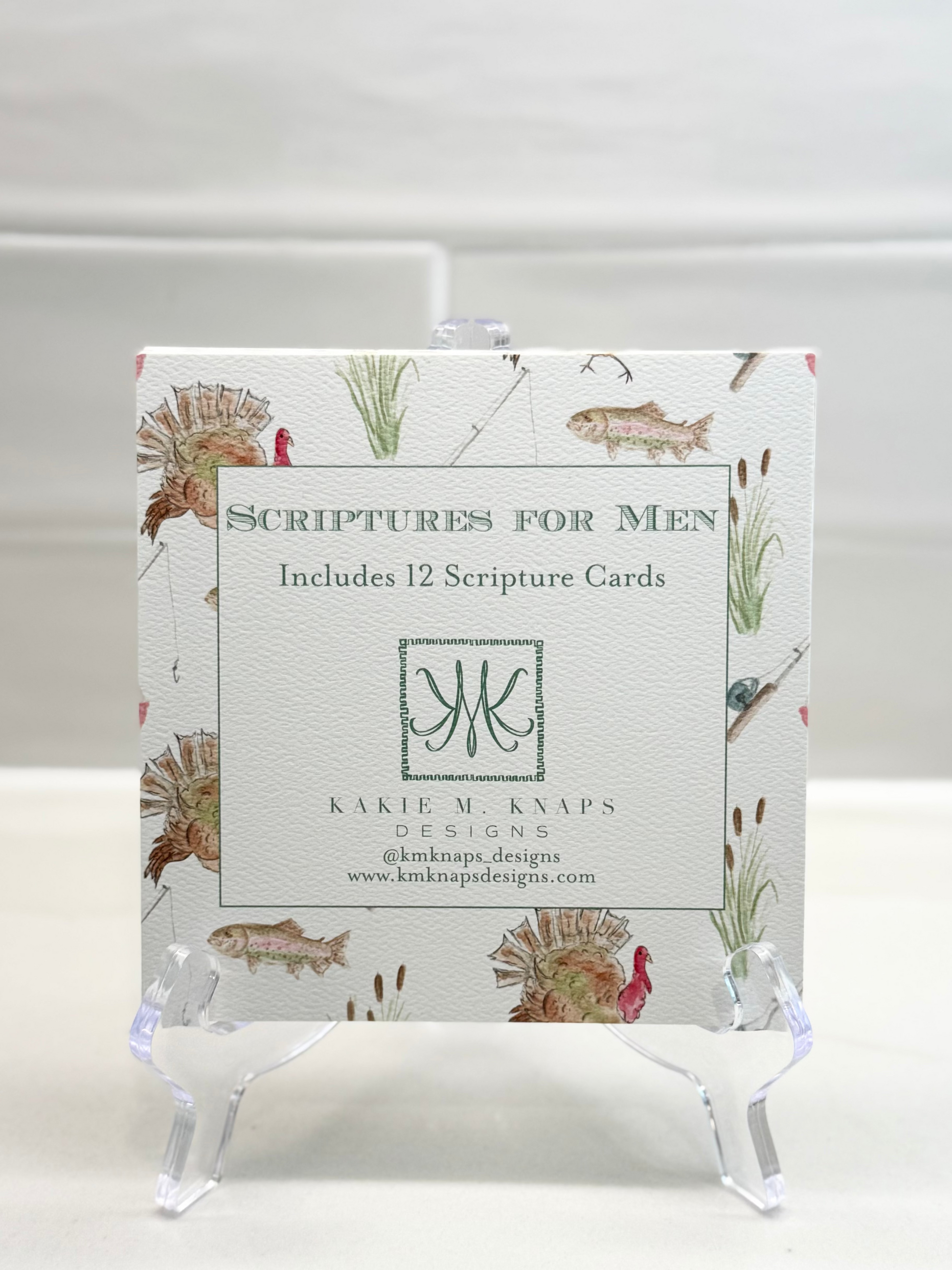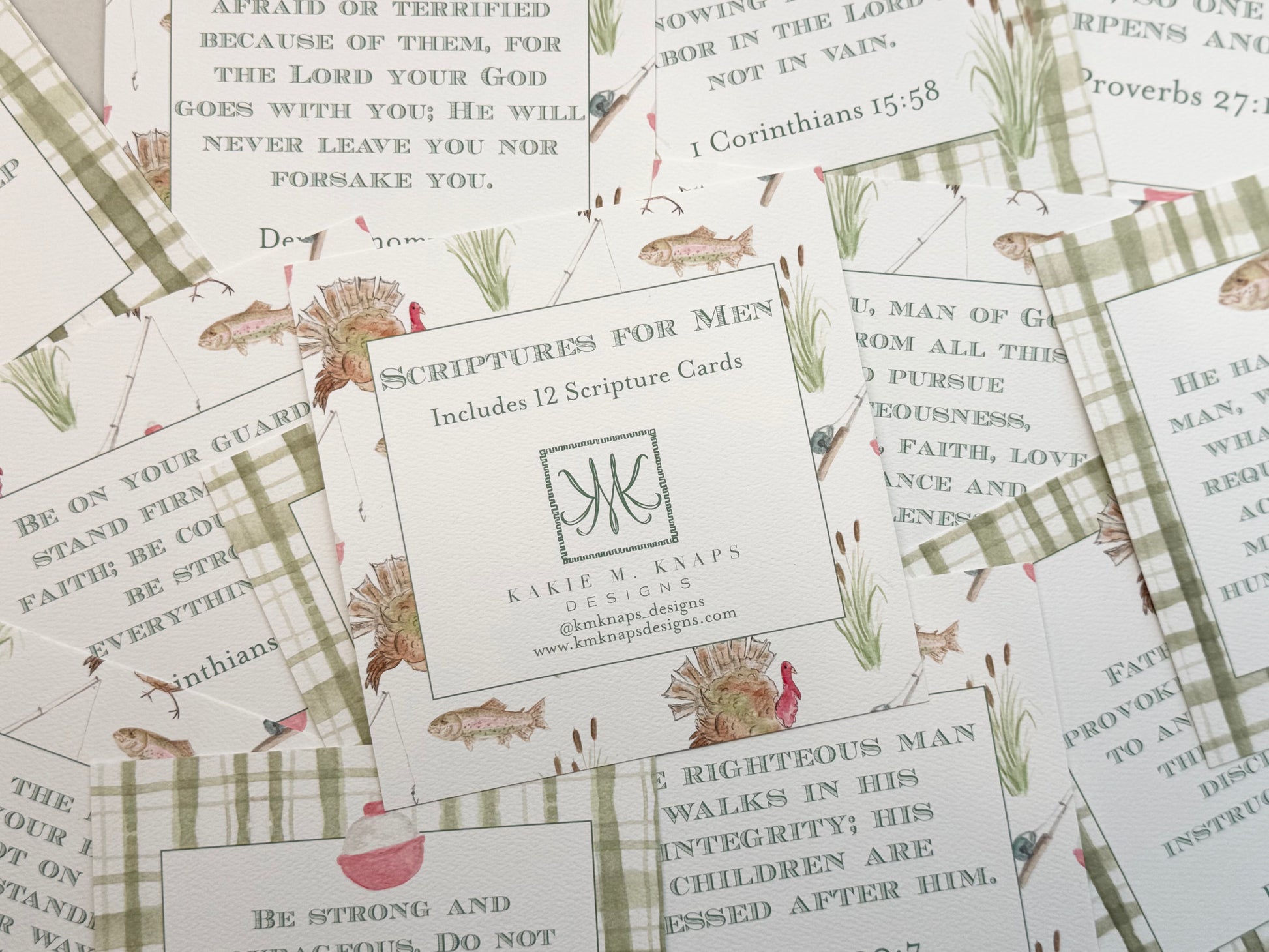Encourage the men in your life with this meaningful set of 12 Scripture Cards, thoughtfully designed to offer monthly inspiration and quiet moments of reflection. Each card features a piece of my original hand-painted artwork—wild turkey, fishing pole, freshwater fish, dark green gingham, and other outdoors-inspired details that feel classic, timeless, and masculine.