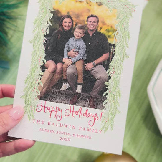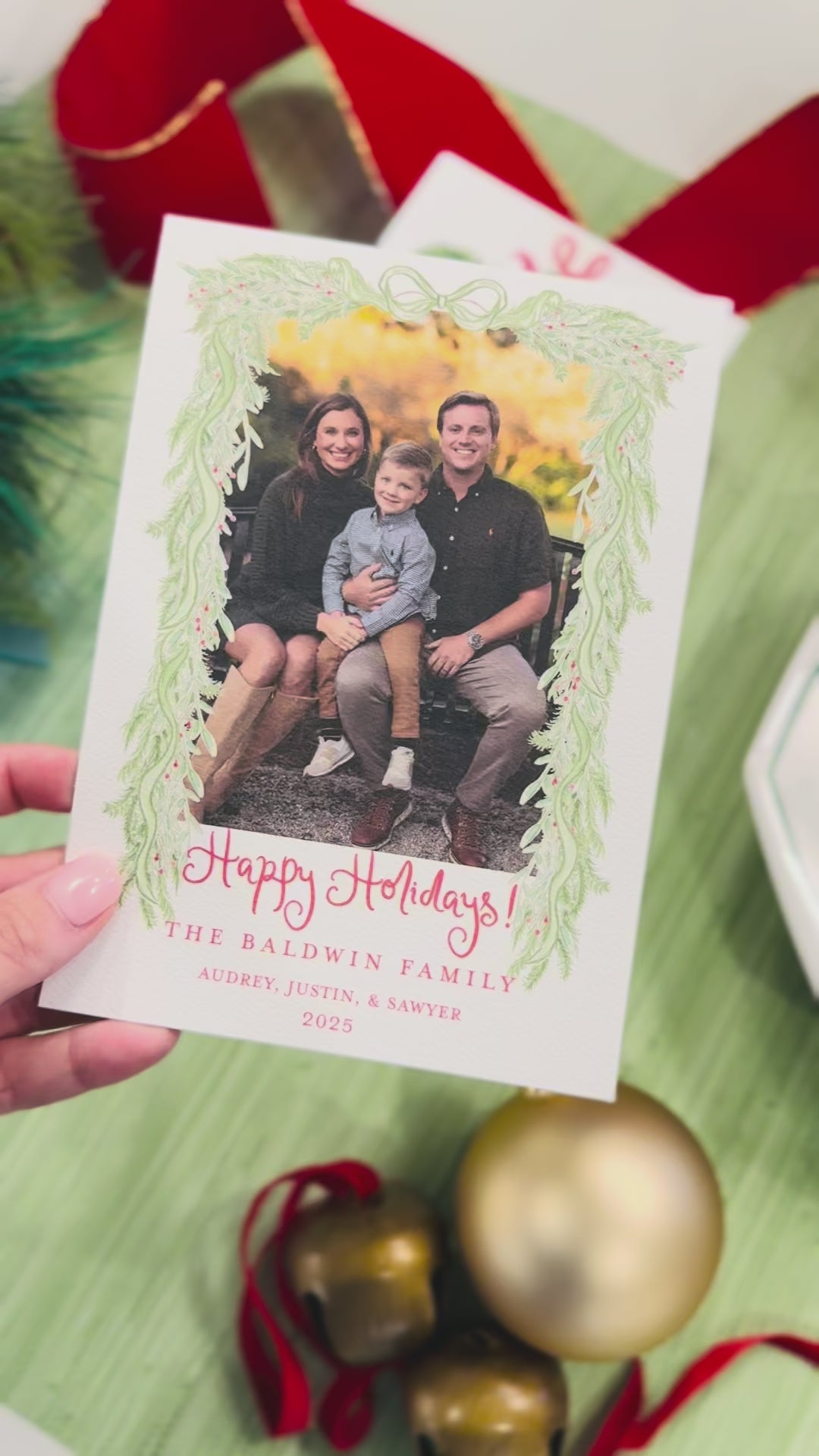 This festive design features garland trailing down the sides of the card, accented with red berries woven into the greenery and finished with a soft green bow. A classic, cheerful look that captures the spirit of the season without feeling too formal.