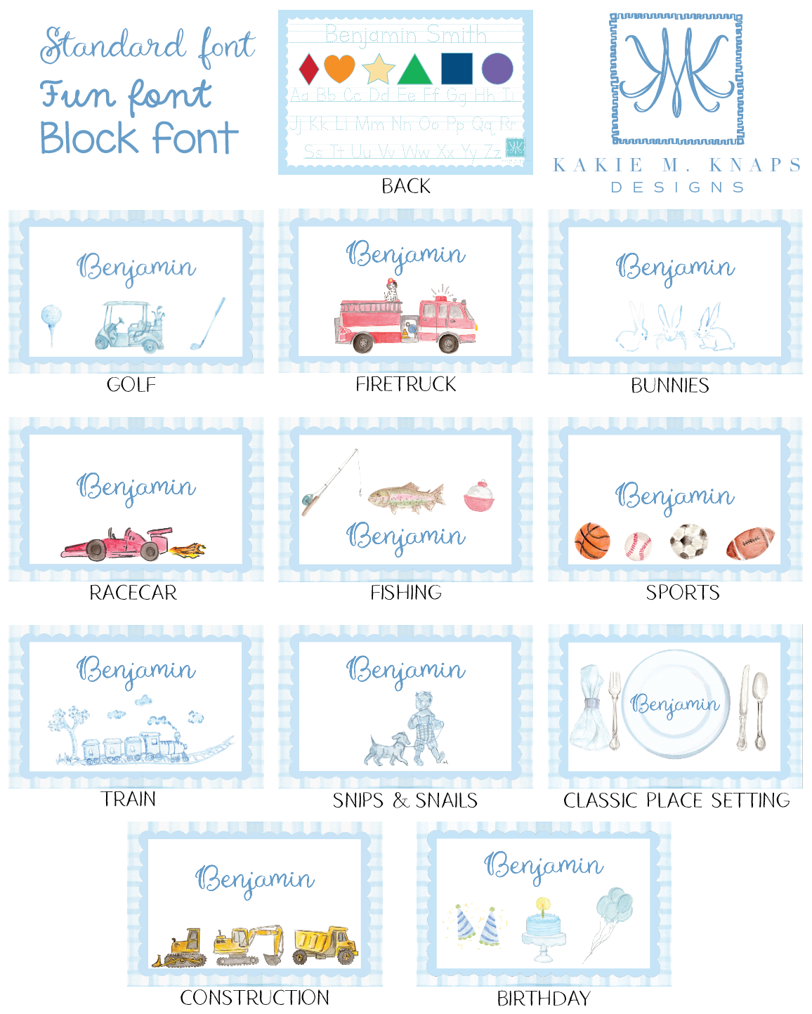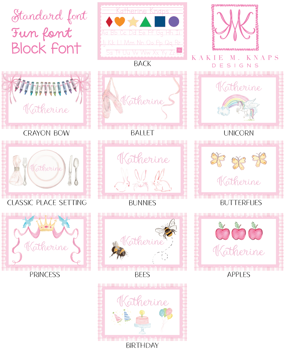 The front showcases your chosen hand-painted gingham background (available in pink or blue) with the artwork of your choice and your child’s name in one of three font options.